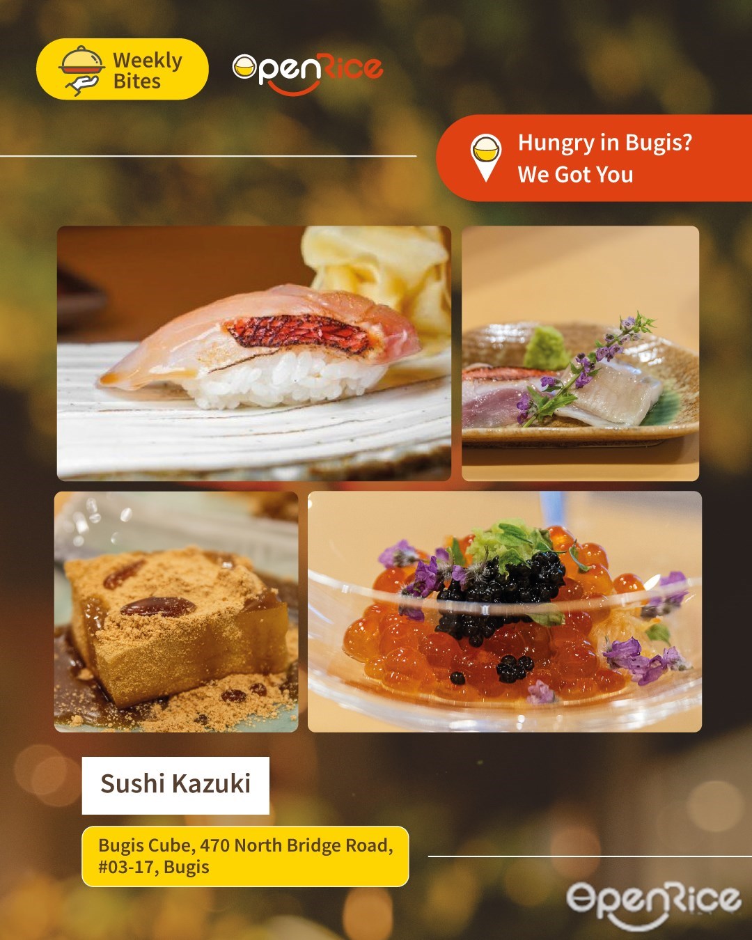 Sushi Kazuki at Bugis Cube is where tradition meets finesse. This intimate Japanese restaurant specializes in authentic omakase crafted with ingredients flown in fresh from Japan. The minimalist setting allows the food to shine — from buttery toro to delicately seasoned sea bream. Every bite showcases precision and respect for seasonality. It’s the perfect escape for sushi lovers seeking a genuine Japanese dining experience right in the heart of Bugis.