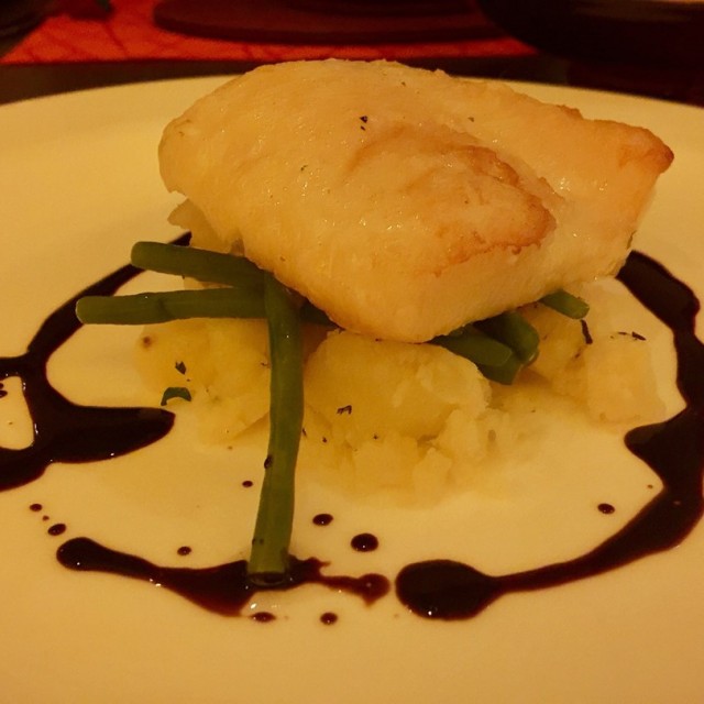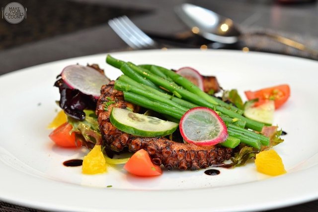 Balsamic grilled octopus tentacles served with fine beans and orange