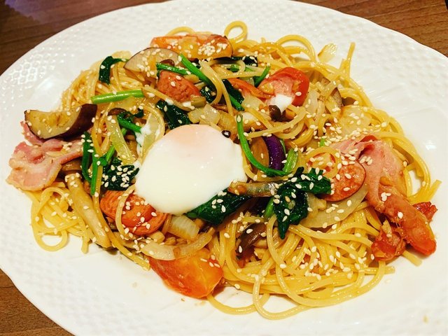 Hoshino Spaghetti with Eggplant, Bacon, Shimeji & Sausage