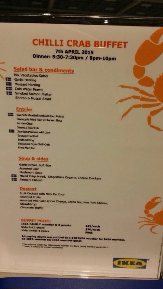 We chanced upon the ticket sales 3 weeks before the Event Date & were very excited to have an enjoyable Feast…we were not disappointed.Anricipating a full car park, we went there half an hour earlier. We were pleasantly surprised that everything was in an orderly manner although the floor was packed with people.I liked…- the ticketing system & the discount vouchers that comes with each Adult Ticket…- the punctual patrons queuing patiently outside the Restaurant…- the polite staffs gently putting the colored ribbons on our wrists for identification…- the neat table settings, the cute bibs, the big plastic bin to throw the shells with…- the quality food that they serve…- the extensive menu that had incorporated both the Swedish & the Local Cuisines…The Herrings go very well with the crackers. The Smoked Salmon is my favorite! It reminds me of our tour to Europe, having it every morning there…The Farmers Cheese is simply marvelous with the rye bread…(wished they'd station a staff to do the carving though…)The thick, creamy Mushroom Soup is everybody's favorite. It is filled with generously sliced mushroom!You can see everyone filling their small bowl to the brim & balancing cautiously not to spill while walking back to their seats…Chilli Crab is fresh & cut into big chunks. The sauce is a little too spicy for me but everybody seems to love it, nearly scraping the plate clean with the fried Mantou!Must save room for desserts for IKEA's Buffet!The Swedish cakes are super fantastic!It's completely cleared out within minutes!It's interesting that this time round the Restaurant kept the Muslim Counter open to the public. Felt sorry for the envious people on that side of the restaurant though…as some greeted their friends who were busy enjoying their succulent Chilli Crab…There is just too many great tasting cuisine to savor…The soup, starters & salad already had me going back (in small potions) again & again!Not to mention there is still the Cooked Food Menu…their famous Swedish Meatballs, Poached Salmon, mashed potato…Ohh…we will definitely be back for IKEA's next Buffet Feast! ~ via Mobile…Read More