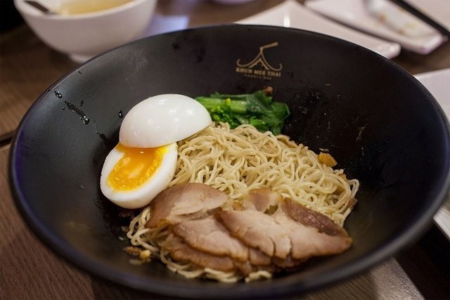 For full review and photos, please visit http://www.makeyourcaloriescount.com/2014/07/sg-khun-mee-thai-thai-chinese-street.htmlKhun Mee Thai is one of the latest Thai casual dining restaurants to join the Singapore's F&B scene with a focus on Thai-Chinese street food. Using ingredients sourced directly from Thailand, Khun Mee Thai improvises its street food offerings by adjusting to the palate of Singaporeans.Most people would be familiar with Thai cuisine but what exactly defines Thai-Chinese street food? Chinese immigraton was a major influence on the evolution of Thai street food, especially in Bangkok, where Chinese coolies worked hard to improve their lives. In their communal living, there was a demand for street-side stalls and typically noodle soups, rice dishes, snacks and sweets were popular offerings.Can Khun Mee Thai bring the best of Bangkok street food to Singapore? Let us find out!These soft rice paper wrappers are largely similar to the Vietnamese rice rolls as each roll is filled with Thai sausage, pan-roasted peanuts, Thai sweet basil and Thai long-leafed coriander. I enjoyed the thin rice wrappers which were not overly starchy and the Thai sweet basil brought a distinctively sweet licorice scent. There was a good variation in texture with the chopped roasted peanuts against the soft Thai sausage. To top it off, the homemade sweet, sour and spicy chilli sauce as an accompanying condiment helped to introduce some flavours to the dish but I found that the sweet and sour elements dominated and lacked any heat.When the salad was served, I intuitively thought of the classic papaya salad but this was quite a different dish altogether. Mixed with glass noodles which were cooked al dente, the zesty chilli and lime dressing packed a bold punch of flavours. I liked that the heat in the dish was balanced by the mint and acidity of the lime which made it quite an addictive and appetising starter. The warm Thai sausage added a second dimension to the dish which was set by the contrasting textures from the chopped peanuts and greens.Originated from Khun Aum's grandmother's recipe, the pork leg was carefully treated with a marinate time of at least two hours followed by four to six hours of braising. The sauce had that classic five-spice flavours which would be adored by some but quite personally I am not a huge fan. Nonetheless, the pork leg was cooked perfectly and was off-the-bone tender. Coupled with the layer of fats underneath the skin, it was almost melt in your mouth. While I enjoyed the beautifully cooked pork leg, the flavours of the five-spice did not quite work for my palate and I would have preferred a simple braise.Dubbed as the signature dish of the restaurant, this Thai version to our commonly known wanton mee introduced some new elements such as the soft-boiled egg with that molten egg yolk. I found the portion to be quite sparing as each bowl had just about two to three thin slices of the char siew, an egg, three small pieces of dumplings with some greens. While the char siew carried a nice bronze colour from the marinade, the thin slices were barely sufficient to taste the juiciness of the fat in that prime choice of cut. I would have preferred a thicker slice to let the flavours carry through.While the egg noodles were cooked al dente, the diners at the table all shared the same view that it was slightly too dry only did we later realise that we did not enjoy the dish the way it was meant to be served!On each table is a row of condiments which include fish sauce, chilli powder, sugar and green chillies soaked in vinegar. Khun Aum later showed us how she intended her noodles to be served! She took a teaspoon each of the various condiments and added them into the noodles before tossing them to give a bowl of authentic Thai-Chinese Ba Mee.It was quite different from the wanton mee that we grew up accustomed to as each mouthful had a lot going on in terms of flavours. There was the acidity from the vinegar and heat from the chillies only to be soothed by the sweetness from the sugar before an unami touch from the fish sauce. We highly recommend trying it the Khun Mee Thai way else it would have been quite pedestrian-tasting.While we were told that the broth was simmered with large pork bones with coriander root, white radish and pepper for six to eight hours, it tasted quite muted in terms of flavours. The dumplings also needed more work as the filling was too little and it was a shame that I tasted more of the starchiness from the wrapping rather than the minced meat itself.It was quite interesting to spot cauliflower in tom yam soup as that is not a common sight but the usual key ingredients such as prawns and mushrooms were present. One can have the option of having the tom yam soup with or without the noodles and may opt for it with or without milk. I preferred the clear soup slightly better as the flavours were bolder and distinctively sharper. While the acidity in the broth was accompanied by the heat and sweetness, I found it to be the dominant flavour which may please some but on this occasion it did not quite match my palate.For those who prefer a milder taste, do opt for the tom yam with milk as that helped to neutralise the heat.Another classic street food favourite, the green curry was mildly sweet and while I would have preferred it to be spicier and richer in flavours, this would suit those with a preference for more gentle flavours.Being one of the popular bar snacks in Bangkok, these deep-fried battered chicken cartilages were something quite new for the diners at my table. While it was apparently not the most well-received dish, I actually enjoyed it a lot as the salt and pepper seasoning was spot on, balanced by that Thai sweet-chilli sauce. The crisp batter on the outside complemented the crunchy joints and if you do not know this already, each chicken only has two cartilages, one from each leg so many chickens sacrificed for this plate!The fried rice