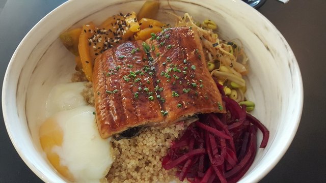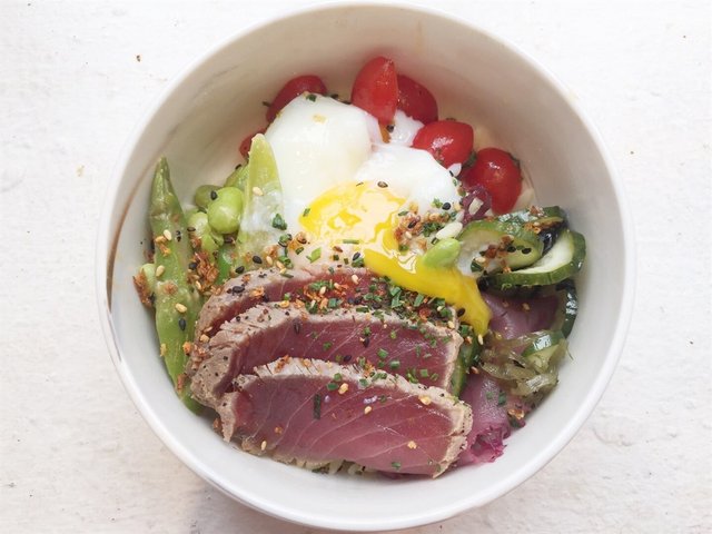 I never thought much about this place which was known for its healthy rice bowls, as I felt it was overpriced Economy Rice (Cai Png 菜饭), until recently I saw a 3-course meal offered by Chop. At $25, the meal includes a starter, a choice of main and a dessert, which I felt was value for money. Only cash and NETS is accepted here.Ebisu (ala carte $18)Pan-seared Hokkaido Scallops, Mussels, Miso Butter Cream and ToastIt was served pipping hot. The seafood was covered in a sea of rich creamy flavourful gravy, which I wished for more.From the 4 choices of main, I selectedTsukiji (ala carte $16)Tuna tataki, asparagus & edamame, onsen egg, pickled cucumbers, cherry tomatoes, furikakeI selected Orzo as my choice of base. There were other choices such as Ninja Rice and Garden Greens. The orzo ( a form of short-cut pasta, shaped like a large grain of rice) was topped with a savoury gravy and quite tasty on its own. The onsen egg added a rich creamy layer to the orzo. The asparagus was soft and crunchy. The pickled cucumbers was tangy and crunchy, while the tuna was smooth and fresh.Fancy French (ala carte $16)Fig jam french toast drizzled in ume-boshi infused honey, fresh grapes, plums, homemade hazelnut butter.This dish had a 20 minute wait. It looked quite pretty. The fruits was fresh and juicy, the toast sliced easily although I wished that it could be crispier.Accompanied with Coconut Lemon Mint ($8)Fresh coconut juice, lemond wedges, mint leavesIt was basically fresh coconut juice, filling with thick coconut flesh. Refreshing, although a bit cheated by the fanciful name.Overall the food was delicious. Best come early as the place get crowded easily, and could get quite noisy after that.…查看更多