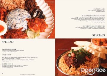 Beef Cheek Rendang / Sinpopo Signature Nasi Lemak / Sotong Hitam with Handmade Crab Tortellini / Crayfish Curry Pho / Fei Po Char Siew / Pulut Tai Tai