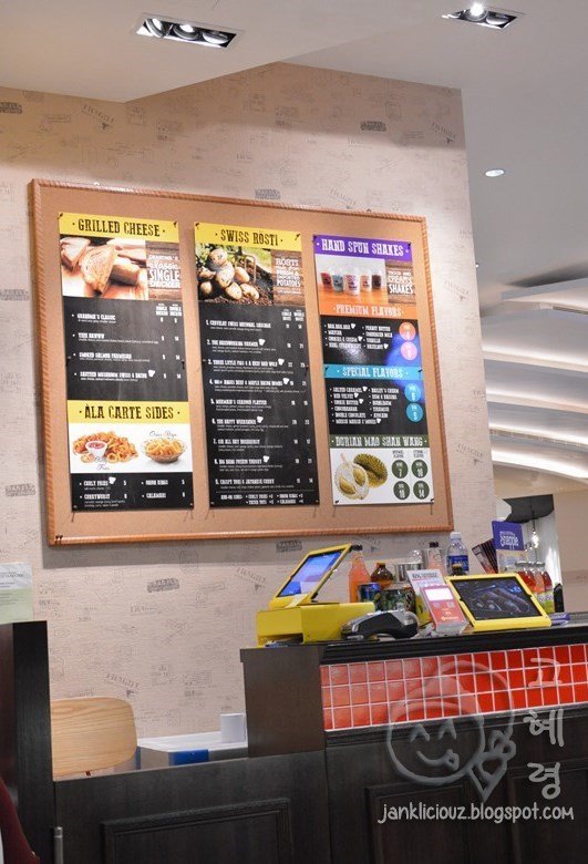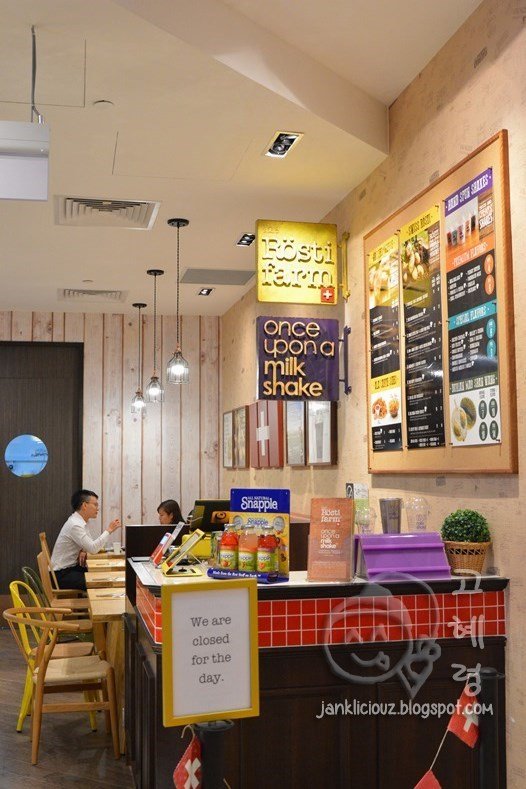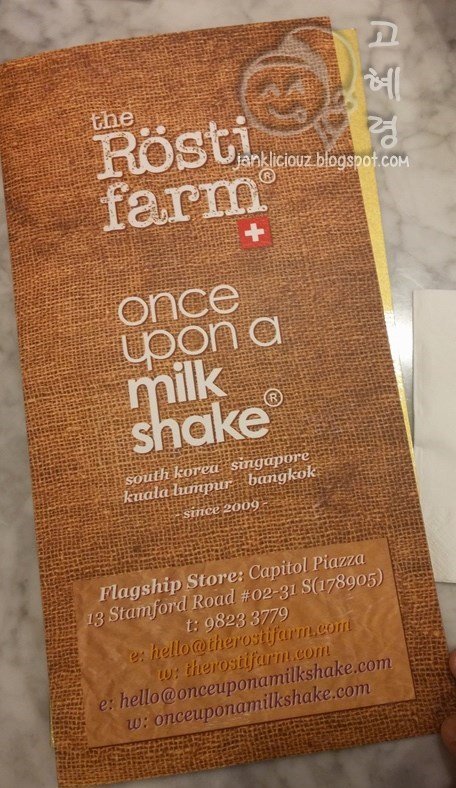 The wife was craving rösti and we ended up at The Rosti Farm (TFR for short), an eatery apparently specialising in the Swiss potato dish. The funny thing is that the place also houses other brands under the same roof/management (Teuscher Chocolates and Once Upon A Milkshake) - so you can have chocolates and milkshakes together with your rösti.Occupying a rather small unit on the second floor of the relatively upclass Capitol Piazza mall, TFR seats approximately 20+ pax in its rather homely premise, complete with wood panel wallpaper and wooden furniture.Milkshake - The milkshakes in general were pretty thick and rich without coming across as too sweet. Pretty good.Three Little Pigs & A Big Bad Wolf - A single rosti (you can opt for a double at an additional cost) topped with Swiss cheese, a black angus beef patty enveloped in provolone cheese, bacon and prosciutto. The rosti had a lightly burnt taste to it but came across as rather oily. Ditto the accompanying pork bratwurst, which was flavourful but oily as well. The melted provolone provided a subtle flavour and gooey texture to the beef patty, which unfortunately was overcooked but thankfully, not too dry. While I appreciated the crispiness and saltiness of the bacon, the prosciutto didn't quite do it for me - a little too limp and lacking in saltiness.The Hardworking Farmer - Consisting of ingredients from the farm; snail sausage, mini omelette, sauteed mushrooms, Swiss cheese with a deep fried chicken drumstick atop, all on a single slab of lightly crisp, salty but relatively oily rosti. The drumstick came across as flavourful but added to the overall oiliness of the dish while the snail sausage wasn't anything to shout about. The mushrooms provided an earthiness but the omelette came across as bland. Although each individual ingredient wasn't great, the sum of all parts made for a pretty decent dish.Our meal cost $51 (no GST and service charge, which is definitely a plus), which isn't too expensive for the decent quality of food (a little less oil would be appreciated though) and drinks. Service was friendly too, which made for a pleasant dining experience.See all my pictures at http://www.timelessfacade.com/2016/01/the-rosti-farm-rosti-milkshakes.html…Read More