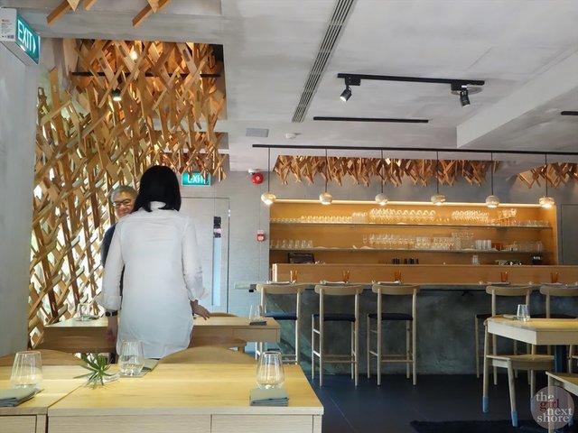 The place was packed for lunch during Saturday. I decided on the omakase lunch which was consisted of 7 courses (S$97++). My only request was the dessert not to be the restaurant's signature Wild Rocket Chendol which I just had a couple of weeks ago. Ice water was served after placing order.Course 1 : Bah Chor MeeNegitoro (minced fatty tuna) topped with chopped spring onion and chilli padi, crispy lards, fried shallots, on top of a bed of warm glass noodles.Course 2 : Thai Pomelo SaladServed with tiger prawns & frozen coconut dressingThe dressing was like a scoop of ice cream and made of coconut, chilli, fish oil, and shallot. It tasted quite lemak. Having it with mint leaf, pomelo, and cilantro, it tasted quite refreshing with hint of spicy and sweetness of fruit. Course 3 : Chilli CrabCrab cake made of blue crab and spanner crab, served with chilli crab sauce.The crab cake was packed with nothing but crab meat. Quite juicy and yummy on its own.Course 4 : Hokkien MeeFresh pasta cooked with prawn stock, and hae ko (black shrimp paste). It was quite flavourful but a bit too salty for me.Course 5 : Wild Rocket Strawberry CheesecakeIt served deconstructed style in a Martini glass. Creamy without too sweet or sour.I was surprised that I was served dessert before my main. I later asked the staff who thought I already had it. In the end I went through what I had with 2 different staffs and decided that there was 2 more courses.Course 6 : Black vinegar iberico pork jowl with pickled cabbage and chestnut pureeThe meat was quite tender and pulled out easily. Quite appetizing with the pickled vegetables.Course 7 : Lychee sorbet with lychee martini gummyThe sorbet was topped with ginger flower and blue pea flower. Interesting flavours of the light lychee and the slightly stronger ginger flower. Quite refreshing.Overall the food was not bad but was a tab upset about my course of dishes being overlooked. By the way as the place was full house, it was quite noisy too.…Read More