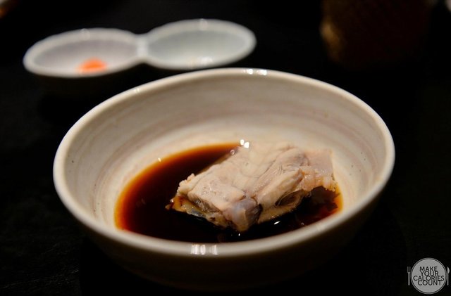 Interestingly, the paper-thin shavings or usuzukuri ends with a sloping thicker end for an elegant presentation as above where the translucent and intricate arrangements flaunt the exquisiteness of fugu. On its own, the sashimi tasted quite bland though it has an unique elastic texture to its flesh.