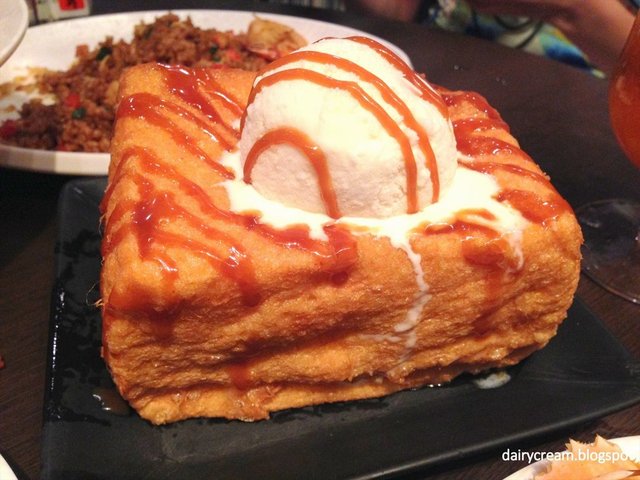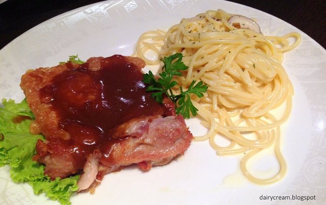 Chicken Chop with Mushroom Cream Spaghetti could be better, if the spaghetti hadn't be dry and under seasoned. But the humble chicken had some delightful crunchy edges and tender flesh. The French Toast with ice cream is rather puzzling because the giant deep-fried bread lacked any egg aroma and was too chewy.