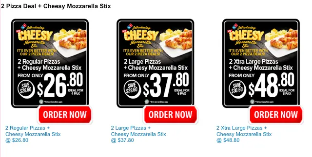 "TIN105B" : 2 Large pizza + Cheesy Mozz Stix at $34.50 (U.P $65.40).