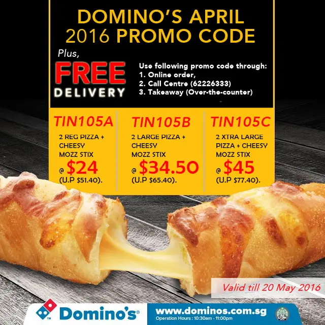 If you're looking to tickle your tastebuds and satisfy your tummy this month, treat yourself to Domino's unbeatable promo deal this May 2016. The pizza deals come in three variations (regular, large or extra large) and are accompanied with their all new cheesy mozzarella sticks! Read till the end to enjoy Domino's Pizza May 2016 promo code in Singapore.