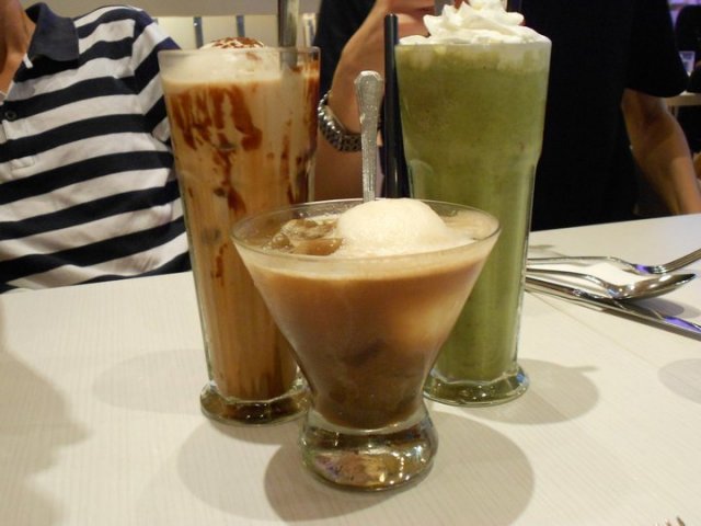 They have an extensive range of beverages and we ordered these three beverages, forgot all the names but the one topped with whipped cream is green tea flavoured, another one in the tall glass is chocolate flavoured topped with vanilla ice cream and chocolate flakes and the one in the shortest glass is a grape flavoured drink topped with shorbet.