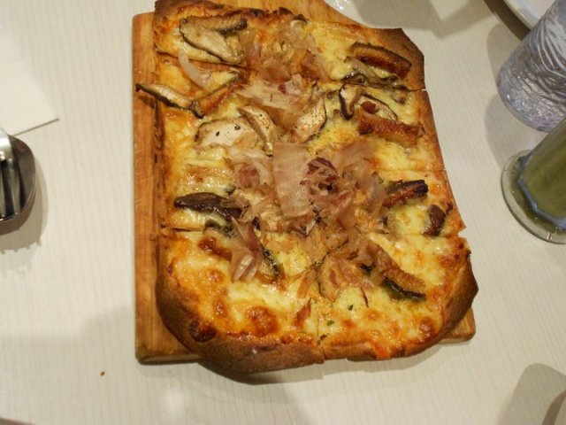 This unagi mushroom cheese pizza was yummy, topped with grilled unagi and shiitake mushrooms. The crust was crispy and not too thick.