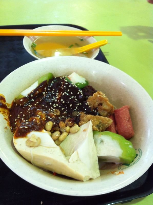 Topped with Chilli sauce, Sweet Sauce (those used in chee cheong fun) and toasted sesames. The tau kwa tasted as if it was going to turn bad as it was a little sour; Bittergourd in its bright green colour (young), was really bitter but the fish paste helped a little in musking the taste so I could at least stomach it down. Capsicum was sweet and crunchy , the fish paste together with it helped added a nice tender texture. Hotdog was average out from a factory packet. Fried beancurd skin was crispy and didn’t have the “stale oil” smell/taste. Fried Ngo Hiong was pretty good as the skin outside was crispy and the filling was well packed and flavourful. Spinach was average, soggy from underneath it all. Soup together with it was light and mellow tasting.