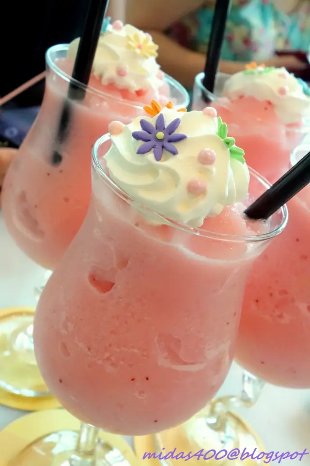All of us ordered the Monthly Special drink, Berri Jubilee $8++, a pretty in pink ice-blended berries drink dressed with vanilla whip cream and topped with lovely flowers and pearls. Photo taking frenzy ensues...