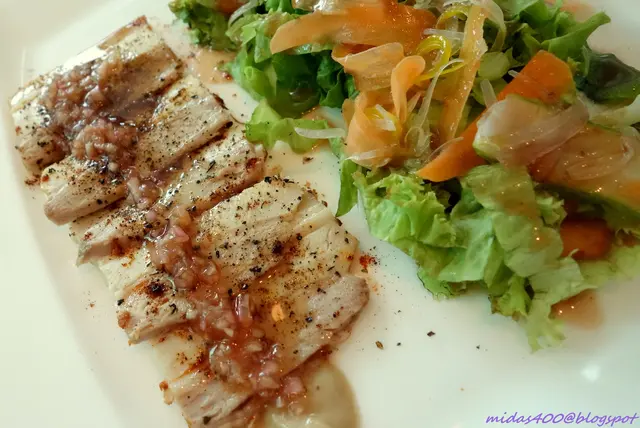 Roasted Pork Belly Salad $16++, thinly sliced pork belly, served with mesclun salad tossed in grape vinaigrette and accompanied with tomato confit and apple purée.
