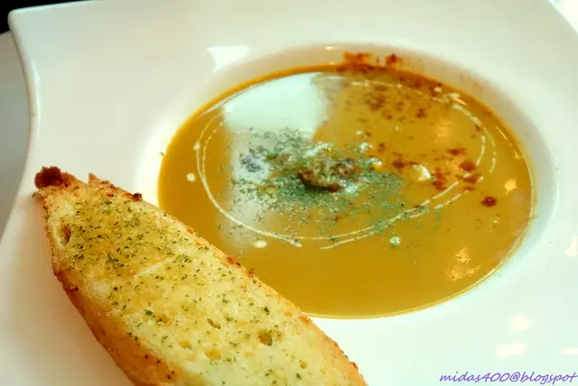 My friend's Crab & Corn Chowder $12++, served with crab claw meat, sautéed corn kernels and garlic toast. The soup does not have strong flavor but has generous serving of crab meat, overall passable.