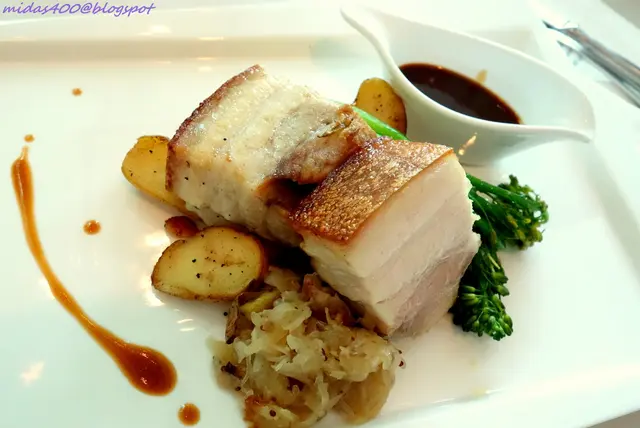 My main course, Roasted Pork Belly with Sauerkraut $28++, served with broccolini, roasted fingerling potato and cider infused brown jus.