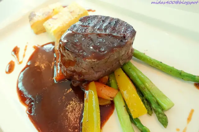Grilled Grain-fed Beef Tenderloin with Red Wine Jus $36++, served with dauphinoise potato, sautéed baby carrots, asparagus spears and capsicum.