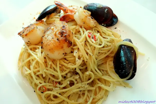 Seafood Aglio Olio $26++, served with with pan-seared giant scallops, blue-shell mussels and prawns. We were quite surprised that the scallops were that huge! Seafood were very fresh and succulent and the pasta was well executed too.