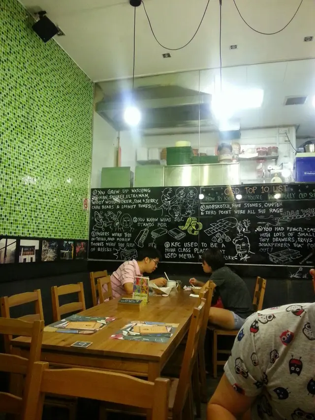 The cafe decoration gives off a strong classroom / school canteen vibe. There's even a blackboard written up with the Top 10 list of the things you should know if you're an 'old school' at heart.
