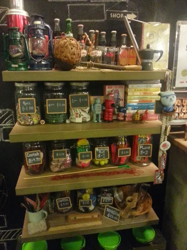 A wall mounted shelving was located at the entrance, selling numerous 'old school' trinkets like captek, marbles, bouncing balls etc.