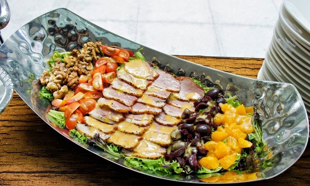 Great mix of sliced smoked duck, mecslun veg, dark cherries and citrus vinaigrette