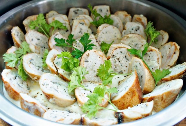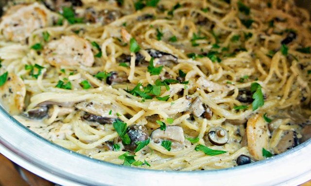 Spaghetti with roasted chicken , mixed mushrooms & truffle cream