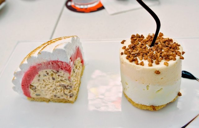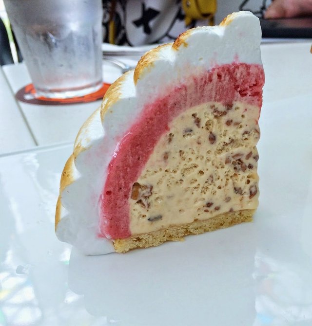 Layers of strawberry sorbet honey parfait, crunchy almond & Italian mint meringue