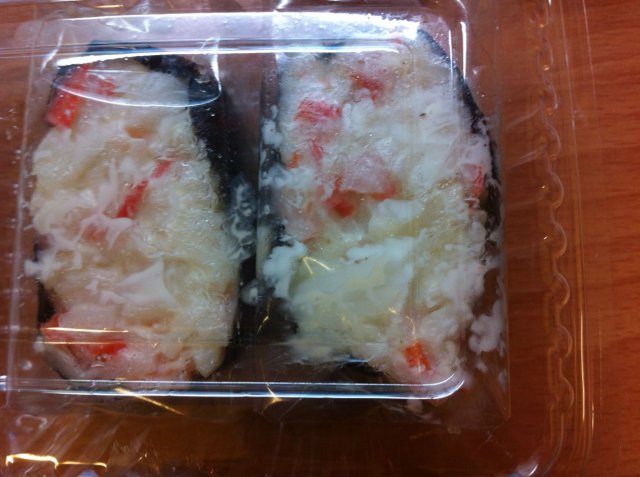 My girlfriend was craving for sushi but as it was not dinner time, we decided to grab something light to settle her craving. We bought a pack of two sushi. She picked the crabstick mayo sushi for the both of us. The crabstick mayo sushi was pretty good, they added a lot of mayo to the crabstick which makes it very creamy. the crabstick was cut into tiny pieces and topped on the rice. the rice had this vinegar taste, it made it taste really light. It was pretty good.