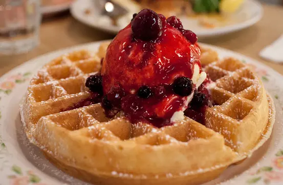Strangers' Reunion waffles are crispy on the outer, but fluffy in the inside. This enable the yogurt and berry sauce to get soak into the waffle when dabbed, allowing the sweetness not just on the outside.