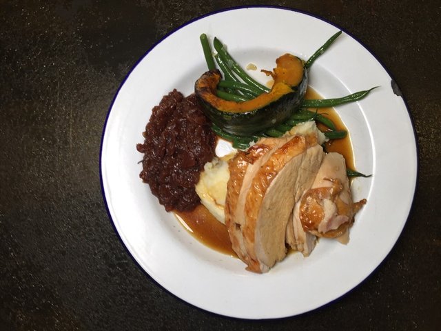 Served with sides of red cabbage, buttered green beans, duck fat fried potato, and bread sauce