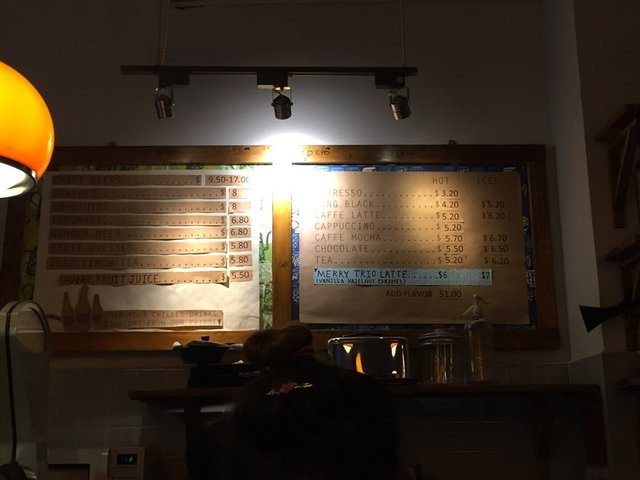 The cafe was located across the road from the MRT station. The place looked cozy and warm especially when outside was raining. The drink menu was listed on the board, with assorted cakes and pastries on the display shelf.