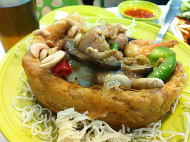 this is one of the delicious dishes in this zi cha shop. the menu is quite extensive and i have patronized thrice with friends and family as this is very nice. the yam is steamed, mashed and shaped into a container shape, then deep fried so the outer layer of this yam container is very crispy. the inner holes of the yam are stuffed with fried vegetables with oyster sauce, very delicious!