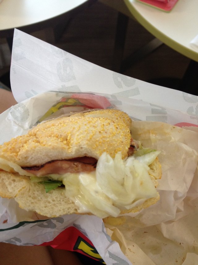I like the Italian B.M.T because it is more flavourful than the other options that Subway offers. Also, the meat is more chewy and has more fats. I ordered this sandwich with lettuce, tomatoes, onions and olives. This time, I also asked for double cheese, however it did not really make a difference to the taste. Next time you are ordering this, try mixing two sauces: sweet onion and mayo. The resultant sandwich is deliciously sweet, salty and creamy. Highly recommended 9/10…Read More