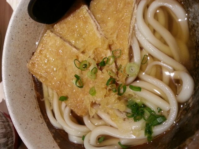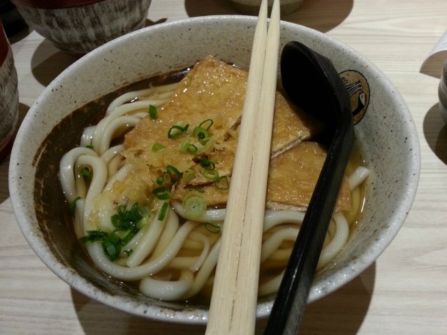 My sister and I decided to visit this restaurant after Cafe Hotel was closed. This restaurant is located at IMM. IMM can be reached by taking the MRT to Jurong East MRT, you have 3 ways to go there. The first way which is FOC, taking the shutter buses provided by IMM at JCube which arrives every 10mins routine. The second way is to take the bus 333 and alight at the stop where IMM is located. The last way is to walk there, due to the tall building of IMM. It will be easy to recognise and walk toward to.The restaurant is located in between M1 store and MacDonald so it's easy to be found. The restaurant is a small place but there are sufficient seats for you to dine in. This place mainly sells udon with different varieties of udon like Kitsune Udon, Niku Udon, Ebi Tempura Udon and many more choices with hot or cold udons too. There are soya sauce, togarashi and sesame seeds with built-in grinder for you to add more flavours and spiciness into your bowl of udon!We had a bowl of Kitsune Udon and Kake Udon with a complimentary mini bowl of rice, with the choice of Deep fried Vegetables or Minced Spicy Pork, and the choice of hot/ice tea. Kitsune Udon ($10.50) is served with a clear dashi stock, chewy and smooth handmade udon (if not wrong), salty and sweet inariage or aburaage (Japanese tofu skin pockets) and sprinkled with chopped green onions. It is a light and comforting dish to eat on rainy days or when you're upset.Kake Udon ($9.50) is served as it's most simple and refining way. The simplest bowl of udon with dashi broth, sprinkled with green onions and tenkasu bits. This simple bowl of udon will lightened up your day and your wallet too