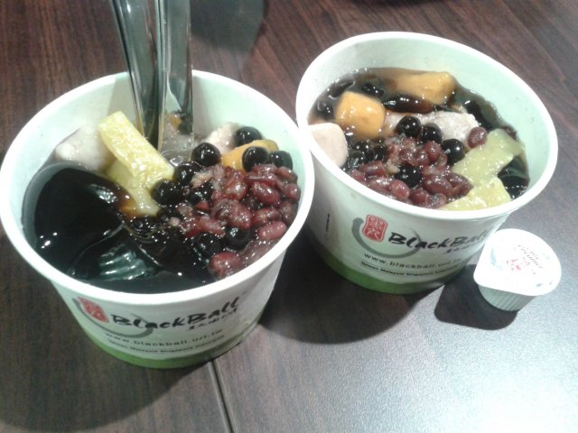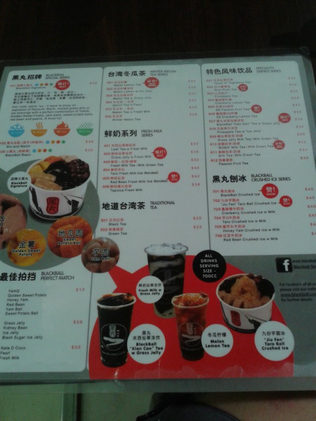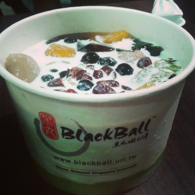 Tried BlackBall from the first time at Bugis +. It is located at one corner and there are seats outside and in the store. I went on a saturday evening and it was packed, full house. We will have to stand and wait for a while before we get seats. It is free sitting, so you will have to look out for people who are finishing their food, and wait beside them. The shop is originated from Taiwan and is said to be the NO 1. Grass jelly dessert there. The menu.You could request from the staff that you would like a copy of the menu. My groups of friends were "blocking the counter" while looking at the menu when the staff passed us a copy of the menu so that we could go back to our seats to take a look, decide before ordering. Their menu have pictures and detailed descriptions of their desserts. They sell alot of desserts which includes bubble tea as well. We ordered their blackball signature to try! You can choose to have it warm, hot, cold or icy. Blackball signature ($4.90 per bowl)We ordered 2 bowls to be shared among the 4 of us. Milk is being mixed together with it. It has a perfect combination of YamQ, golden sweet potato, yam balls, sweet potato balls, red beans, pearls and grass jelly. The grass jelly is really smooth and it will just melt in your mouth, no wonder they are the No 1 grass jelly dessert in taiwan. The grass jelly is awesome! The combination of all those chewy balls are great. It is very similar to our Singapore BOBOCHACHA! The only difference is that it has much more combinations/ingredients than the bobochacha. It is really a MUST TRY! I will definitely go back to try the other desserts and their bubble tea. …Read More