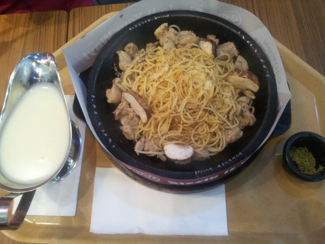 we liked to dine in Pepper lunch where you can add honey brown sauce in as the foods being cooked in sizzling plates we ordered the chicken set meal at $12.90 whereby we top up $ 3 to get a whipped potato and a soft drink and pasta basil cream set meal at $15.50 to top up for salad and soft drinkThe chicken is very tender and absorb the honey brown sauce thus it was sweet . The pasta basil cream come with a separate bowl whereby pour when ready to eat . The mushroom is chewy , the chicken taste nice with the creamy sauce . The noodles is very chewy . The whipped potato is creamy and soft with gravy …Read More