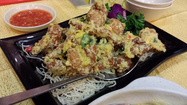 We wanted to go to Wo Peng but it was full house and we did not make a reservation. So we walked down the street and chanced upon this restaurant. And it was a blessing in disguise! The restaurant served a variety of stuff! For instance, there were 10 types of chicken dishes in the menu! We ordered their signature tofu, together with salted egg pork ribs and 3-egg spinach. They served fried crackers and wet tissues, which you can opt not to have if you want to reduce unnecessary cost. The spinach was average and were a little harder than what i preferred. The starch gravy was not the most flavourful one that i have eaten. Their tofu was good, a little hard on the outside and jelly-like soft in the inside! On top of it were cai po (salted garnish) and flour bits, which gave the crunchy feel as you eat the tofu together with the rice. Delicious! The best of all was the salted egg pork ribs. This is the best salted egg marinated dish i have ever eaten! The pork ribs was actually without bones and the meat was soft. The salted egg flavouring was throughout the pork meat, unlike some places where you wished you had more salted egg! However, it does seem a little too salty after eating more than 5 pieces. Nevertheless, it was my favourite dish! We ordered all Small sizes as well as a bowl of rice each and were really full in the end. Total cost amounted to $32 for 2 pax. Reasonable.…查看更多