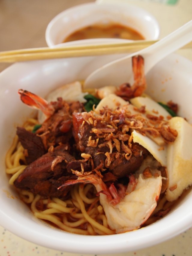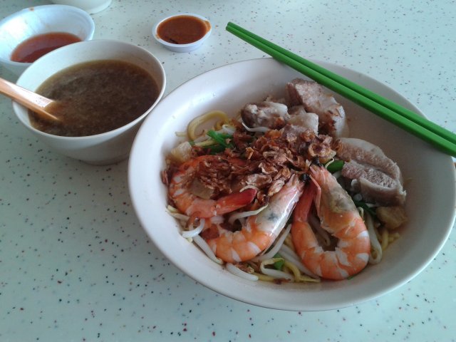I decided to try the prawn noodle from this stall when my regular was closed on that day. I ordered yellow noodle with prawns and pork ribs. The size of the prawns used was indeed big. They do have bigger prawns if you are willing to pay more. It served with soya sauce braised pork ribs. It tasted much nicer this way. They added a handful of dried shallots before served. This was a satisfying bowl of prawn noodle.…查看更多