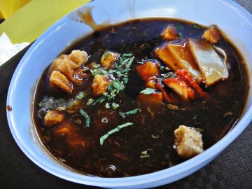 Bukit Batok Street 11 has a number of Kopitiams with popular foodstalls that have long queues.One of them is Tiong Bahru Lor Mee. I was not sure was this the same Lor Mee stall as the one at Tiong Bahru Food Centre as they shared the same signboard name. The appearance of the Lor Mee looked quite delicious with very dark brown gravy and colourful items.The starchy gravy tasted good with heavy braised meat stock and vinegar aroma. There were char siew, braised pork, fried meatball and crispy taupok. The fried meatball was their special item, when dipped in the braised gravy, it tasted good.I was not sure why there was char siew and crispy taupok as they did not really taste well with Lor Mee gravy.查看更多