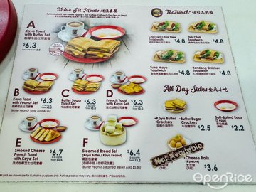 雞肉叉燒吐司三文治 / 法式吐司配咖央醬 / 冰咖啡 / 咖央醬與花生蒸麵包 / 咖央醬吐司配牛油 / 水煮蛋