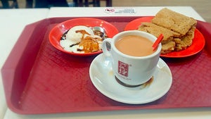 Yakun set 1 coffee 2 pc of toasted bread kaya with a slice of butter and half boiled egg at $4.60.I love to patronise this stall for their high standard of serving good toast and coffee except that the price kept increasing. Coffee has now gone up to 1.60 for a small cup. The toast was crisp and there were crumbs with every bite. The egg was done very nicely at right temperature and tasted good.…查看更多