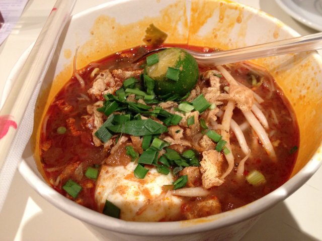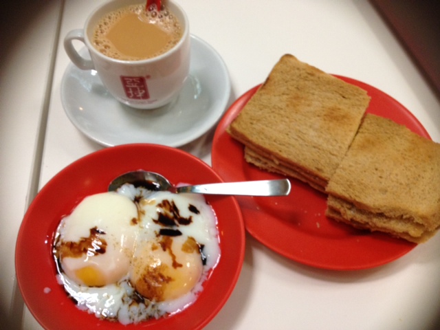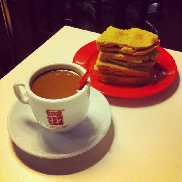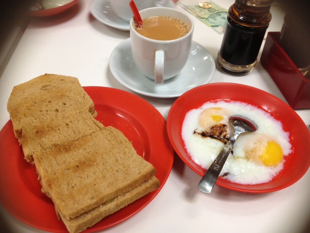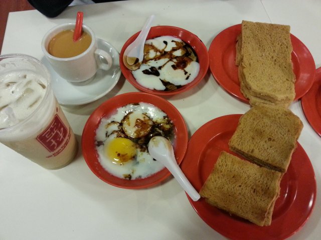 。食物的種類選擇不多,抬頭看看就是了,招牌吐司、冷熱飲品、吐司套餐就是全部,另有4款易飽肚的東西:叻沙(Laksa)、馬來西亞鹵麵(Mee Rebus)、泰國酸辣米粉(Mee Siam)及咖喱雞(Curry Chicken)。咖椰牛油吐司套餐,包兩隻糖心蛋及啡茶一杯。一份咖椰牛油吐司有4件,咖椰醬本身雖然偏甜,但薄薄塗得平均,再夾上一小片牛油,甜度恰到好處,全麥吐司亦鬆化脆口