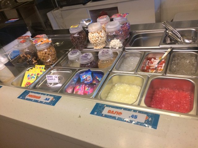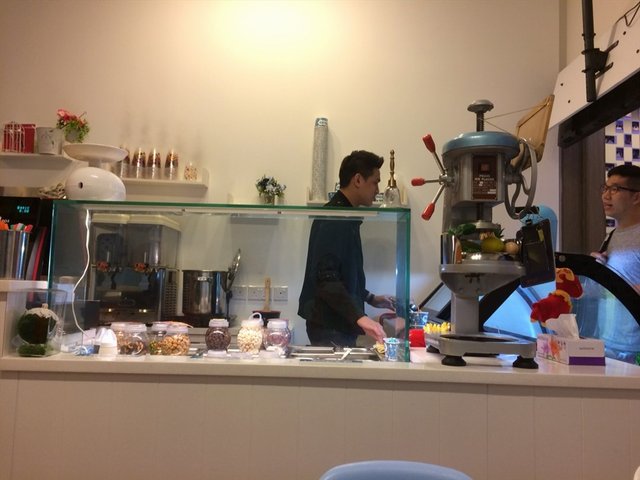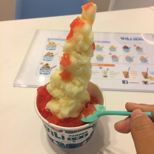 Located at B2 just a minute walk from Somerset MRT is YiLi Pao Pao Ice! It's a popular taiwanese dessert and though there's a huge bingsu craze, here's the biggest difference. The shaved ice here is made of real fruits and there are fruity chunks in the shaved ice as well!There was a male staff at the counter who was super cheerful and friendly! You can sample the different flavours to try before ordering.There are also tons of toppings starting at just 45 cents. The star shaped nata de coco caught my eyes!1. Shaved ice with one topping $4.95 + 45 centsI got peach and valentine fruit shaved ice. He first placed the valentine fruit at the bottom and then a layer of my star shaped nata de coco and proceeded to put the peach shaved ice on top and ending off with more stars. Checkout the spoon! It's like a heart shaped spade. Super cute!It seriously reminds me of a christmas tree. The cafe was quite cosy with Taiwanese pop songs playing in the background. There were young girls in the cafe enjoying the shaved ice desserts. It's actually quite a big portion for one to finish it all, but it is also very addictive. I didn't find it too sweet at the begining, but at the end I realized it was too sweet. The nata de coco itself was also very sweet. But I enjoyed the chunks of fruits in every spoon full. I will definitely be back to try their peanuts & kidney bean flavour, which has been highly raved on several media platforms.…查看更多
