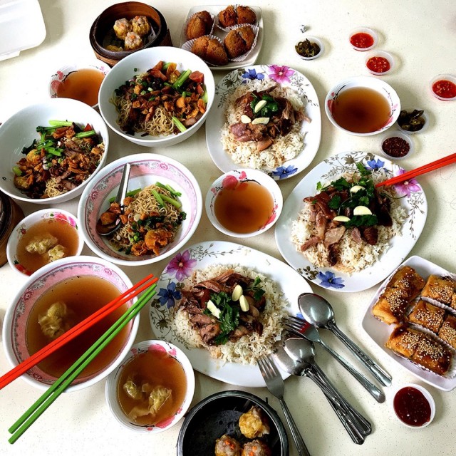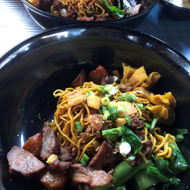 The stall was located inside a coffeeshop. It was well known for its thai style wanton noodles and attracted long queue. But today it was raining quite heavily during lunch time, and it like a queue of 8 persons in front of me, so was too bad. While queuing up the staff took order and payment. Don't forget to help yourself to the condiements such as deep fried lards, green chilli, and chilli flakes.Wanton Mee Regular with extra ingredients ($5)The serving looked fairly small in the huge bowl. Although the noodles looked rather dry without sauce, it was quite tasty on its own. The cured fish sausage was not bad, topped with 2 pieces of deep fried wantons, but the char siew was lacking the sweetness which I preferred. It served with 2 wantons in soup. Pig intestines ($2)It was served with slices of raw garlic. The serving looked quite small. Although tender, the intestines still had a quite powdery texture with a slight bitter taste. A hint of need of a better cleaning job.Overall food was not bad but I felt it was a tab overpriced.…查看更多