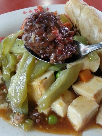 Decided for vegetarian food as the queue of Hup Seng Heng's was exceptionally short. Opted for its brown rice, instead of the plain or its bee hoon as it is whole grain and more nutritious than white rice as they are rich fibre and irons. I had selected 3 kinds of dish, mock char siew meat, toufu and bitter gourd together with its vegetarian style poh piah and it costs me S$3.60 in total. The poh piah was cripsy and filled with stripes and stripes of juicy turnips in it. When served, the stall helpers would help us to cut them into small pieces. Dishes were warm and bitter gourd tastes rather bitter while the beancurds were cut into cubes and cooked in sweet tomato sauce together with mix beans.…Read More