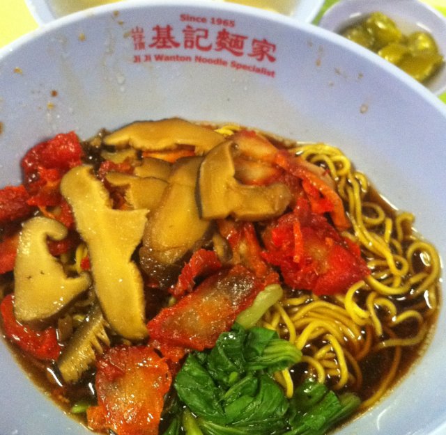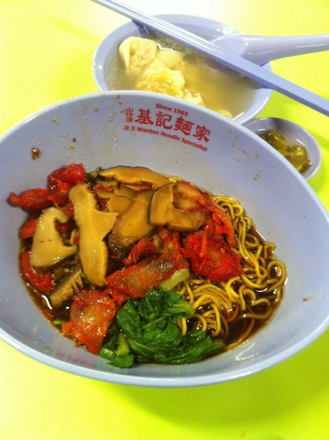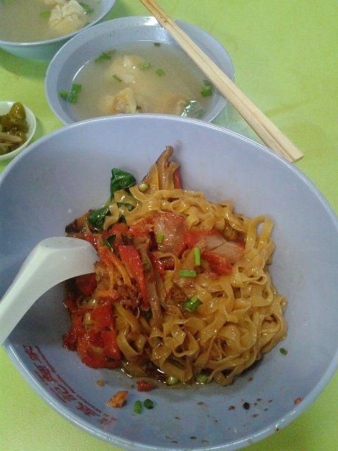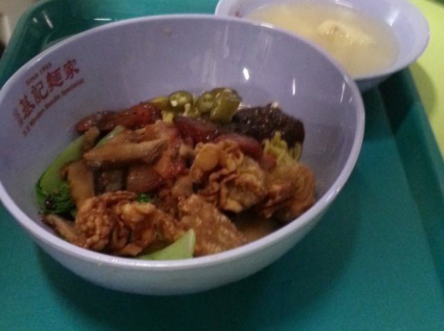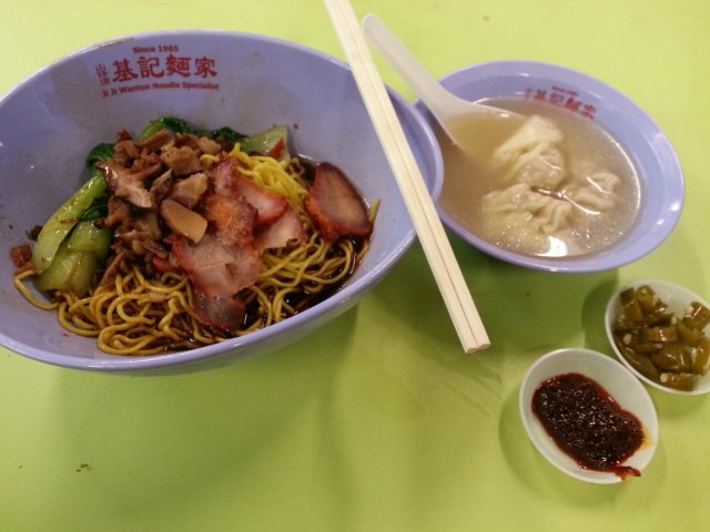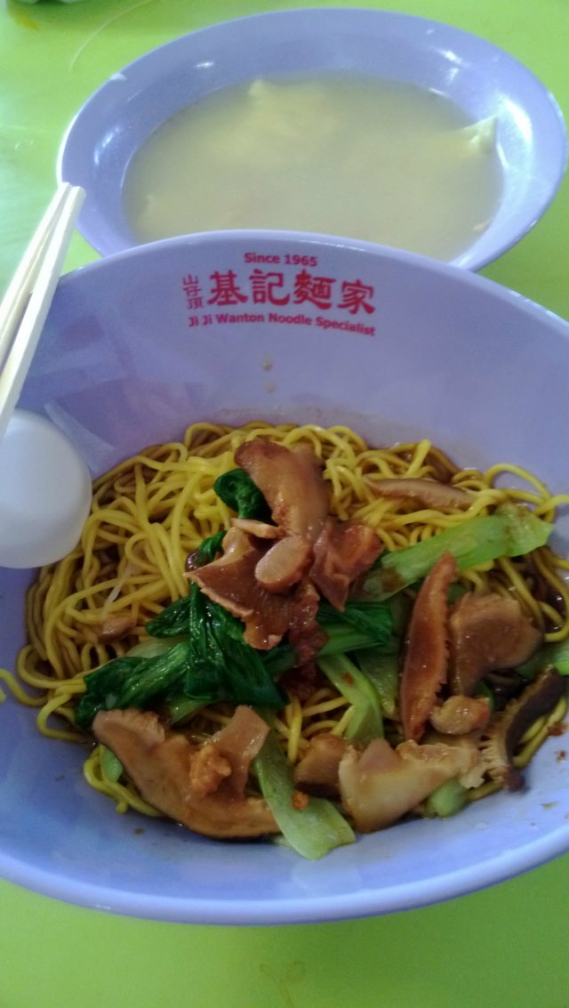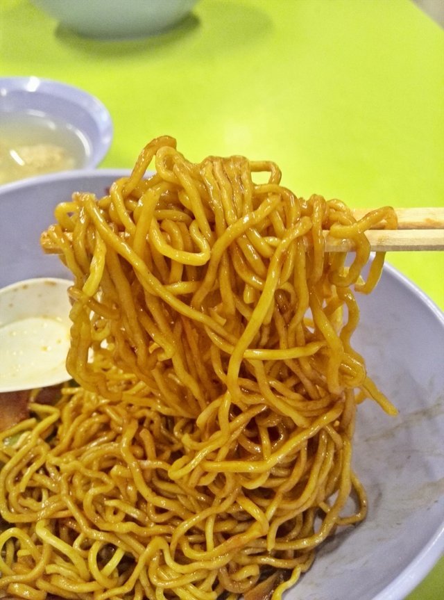 My friend introduced me to this Wanton Mee stall at Hong Lim Hawker Centre. This stall was located behind and away from the front view of the hawker centre, hence I had a hard time finding this stall. There was no much queue after Lunch hours. I ordered the normal Wanton Mee Kia at $3. They served the Wanton Mee in a cute oval shape bowl.The Wanton Mee Kia had a heavy aroma of pork lard and savoury special sauce. The special sauce tasted like char siew sauce with hoi sin sauce. Their mee kia was unique, different from others, a bit thicker and springy like kolo mee. The Char Siew was very good, roasted on the outside with very sweet malty taste. The Char Siew meat was tender and fatty.The wanton in the soup however was small and less meaty. The minced meat marinated was good in the wanton, I could taste the crushed dried fish in the wanton meat.…查看更多