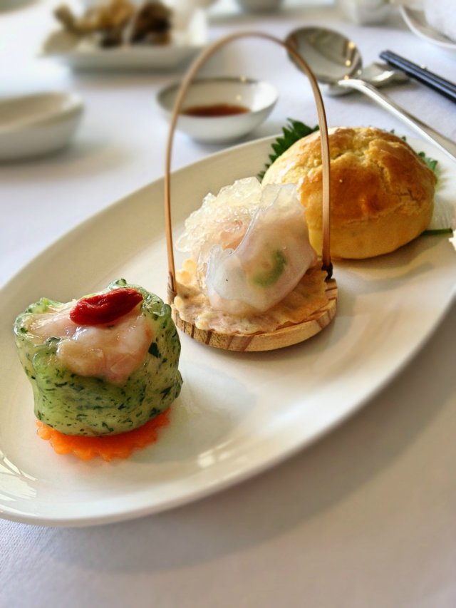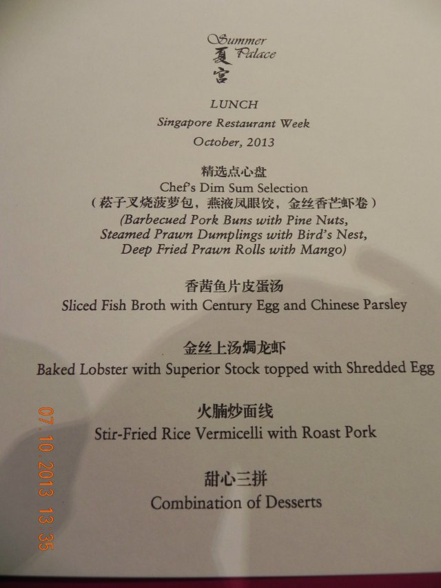 It was restaurant week again and we decided to do Chinese for once. Since neither of us had ever been to Summer Palace, we decided to give their lunch a shot.Located on the third floor of Regent Singapore, just a level above Basilico (http://www.timelessfacade.com/2008/09/basilico.html), Summer Palace houses a rather traditional Chinese interior complete with wooden chairs, golden pillars and a floor of red trim carpeting. We were lucky to be seated by the window (3 such tables available) but there was honestly no view to speak of except for the pool below and the hotel guests sunbathing by it. Still, I appreciated the serenity of the whole place.Chef's Dim Sum Selection - Deep Fried Prawn Roll with Mango - I liked the crisp, deep fried rice noodles that encapsulated bits of crunchy prawn but unfortunately, the taste of mango was almost non existent. What was interesting was that the mayonnaise that came served alongside actually had hints of mango in it. Or was I imagining things?Barbecued Pork Bun with Pine Nuts - Boasting a crusty, not too sweet top and a generous filling of sweet, mildly gooey BBQ pork, the bun was actually pretty respectable. However, unlike my personal favourite from Lung King Heen (http://www.timelessfacade.com/2014/06/lung-king-heen-part-iii-hong-kong.html), the sweetness from the BBQ pork actually overwhelmed the nutty taste of the pine nuts and the bun itself wasn't as soft or chewy.Steamed Prawn Dumpling with Bird's Nest -This was your typical 虾角 with a mere aesthetic upgrade aka tasteless shreds of birds nest. Throw in a relatively limp dumpling skin and you have an average prawn dumpling.Double Boiled Ginseng with Fish Maw, Conpoy and Bamboo Piths - Although I'm personally not a fan of ginseng, this soup was quite good in my humble opinion. Tasty yet light with the mild taste of ginseng helping to keep the nausea at bay and the spongy fish maw coming across as crunchy.Stir Fried Fish Cubes with Asparagus in Teriyaki Sauce - Flaky and smooth flesh coupled with a light sweetness from the teriyaki sauce and a mild savouriness from the stir fried garlic and ginger. Pretty good. Only issue I had was that the sweetness of the teriyaki dominated the natural sweetness of the cod fish, which I personally am quite a fan of.Fried Glass Vermicelli with Crabmeat and Black Pepper - A tad chewy with an abundance of wok hei, crab meat shreds and black pepper for that mildly peppery kick, the glass vermicelli was pretty decent. And the beansprouts added a nice crunchiness to it.Combination of Desserts - Osmanthus Jelly with Wolfberries - Nice and sweet with the wolfberries tasting very similar to raisins.Mango Sago - Chilled and a tad runny but thankfully, not too sweet. Not as refreshing as I expected and could probably do with a little tartness and a little more time in the fridge.Lemongrass Jelly - I absolutely dislike lemongrass but this turned out surprisingly acceptable. The lemongrass taste was rather faint and it tasted like your regular ice jelly dessert with crunchy bits of aloe vera. Very decent.And so concluded our lunch, with two restaurant week lunch sets and a pot of 龙井 hitting the century mark. Pretty satisfactory lunch but I personally don't deem it wow enough for a return visit, not when the normal ala carte prices seem a tad steep for the quality of food. Service was excellent though; warm yet unintrusive.See all my pictures at http://www.timelessfacade.com/2015/05/summer-palace-restaurant-week-lunch.html…查看更多