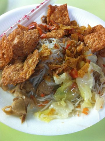 I was looking for something to eat in this hawker, and decided to get some vegetarian food, and I think that this stall is quite popular for its bee hoon. I really like fried beancurd skin, so I chose it - crispy thin and very addictive, and not very oily. I also had cabbage and some mock meat item. The whole plate costs $2; very cheap and reasonable, and a fuss-free meal as well.…查看更多