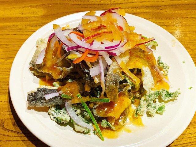 Crispy Fish Skin with Fried Kang Kong Salad (脆香鱼皮蕹菜)