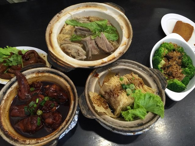 Just to put it out there that this Bak Kut Teh is the herbal type. So this is the Malacca herbal type that is very nice. Our family of 4 had:* one pot of Bak Kut Teh for 2 pax with enoki mushroom and pieces of tau Kee - very nice soup though I found the pork ribs a tad tough* sesame ginger chicken - we love the sauce and my girls ate almost all the chicken pieces, leaving us to taste the yummy dish from sucking the chicken bones only. So I did the next best thing which is to put the pork ribs inside the sauce to glaze it. Yummy!* braised pig's small intestines - tasty pieces with no funny piggy smell* crispy tau Kee - this is a wonderful dish with layers crispy tau Kee stacked together and glazed with their braised sauce. I've eaten at many Bak Kut Teh places and this is the first place I've seen this done this way! Champion! I wanted to order another but had to stop myself* broccoli and mushrooms - simple dish of blanched broccoli and seasoned with sesame oil and soy sauce. Approved by my girls so you can trust. We had all these with the must-have braised peanuts and you tiao, they were average but nice enough.The meal is essentially very nice and the soup is refillable so that's great! Another great thing is the price tag. The whole meal costed us about $50 which is really value-for-money for a BKT meal. Will return for more!!!…查看更多